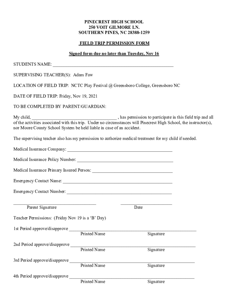 PIECRUST HIGH SCHOOL 250 VOID GILMORE LN. SOUTHERN PINES, NC 283881259 FIELD TRIP PERMISSION FORM Signed form due no later than Tuesday, Nov 16 STUDENTS NAME: ___ SUPERVISING TEACHER(S): Adam Few