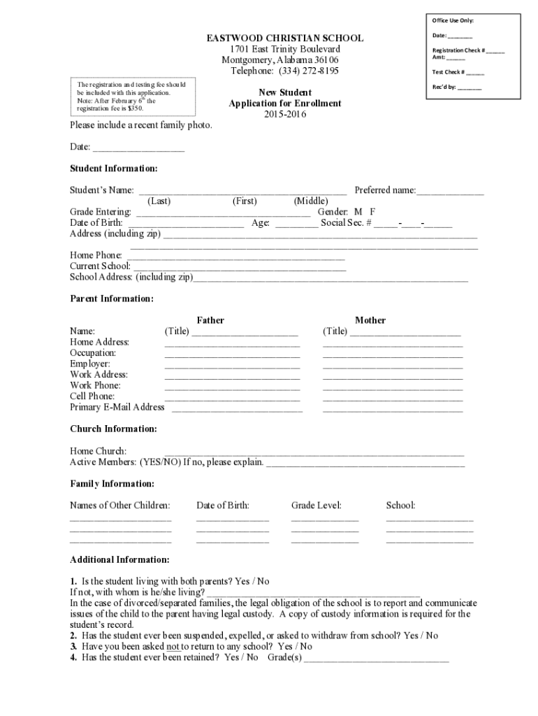EASTWOOD CHRISTIAN SCHOOL 1701 East Trinity Boulevard Montgomery, Alabama 36106 Telephone: (334) 2728195 The registration and testing fee should be included with this application. Note: After February