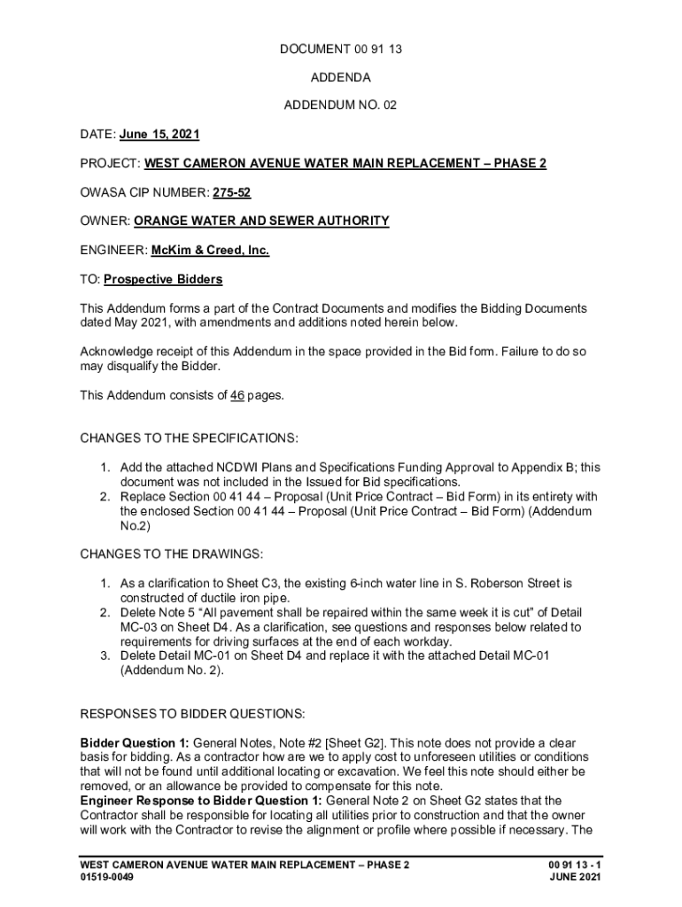 DOCUMENT 00 91 13 ADDENDA ADDENDUM NO. 02 DATE: June 15, 2021, PROJECT: WEST CAMERON AVENUE WATER MAIN REPLACEMENT PHASE 2 OW ASA CIP NUMBER: 27552 OWNER: ORANGE WATER AND SEWER AUTHORITY ENGINEER: