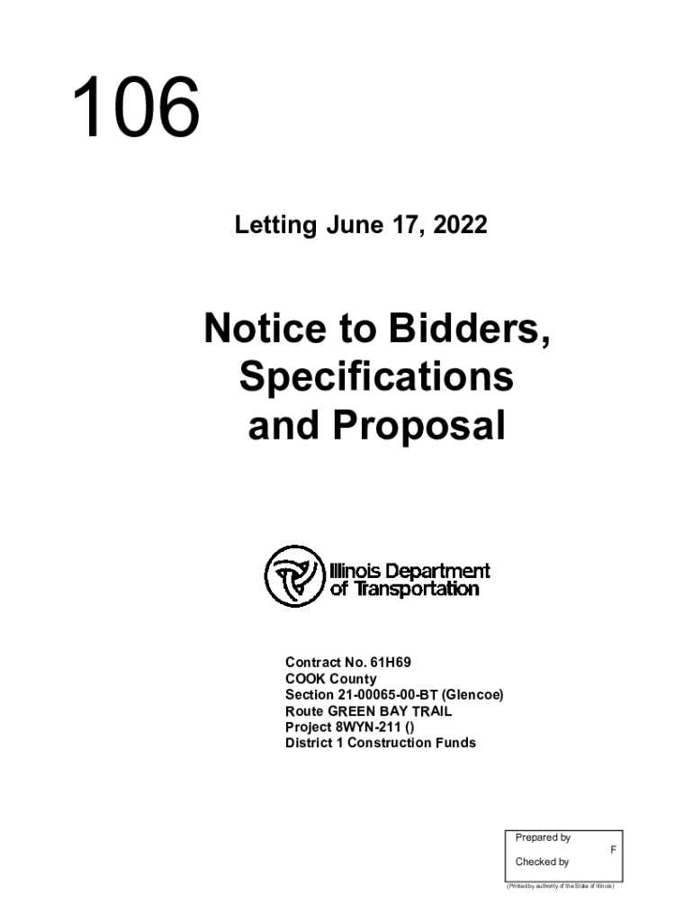 106 Letting June 17, 2022Notice to Bidders, Specifications and ProposalContract No. 61H69 Cook County Section 210006500BT (Glencoe) Route GREEN BAY TRAIL Project 8WYN211 () District 1 Construction