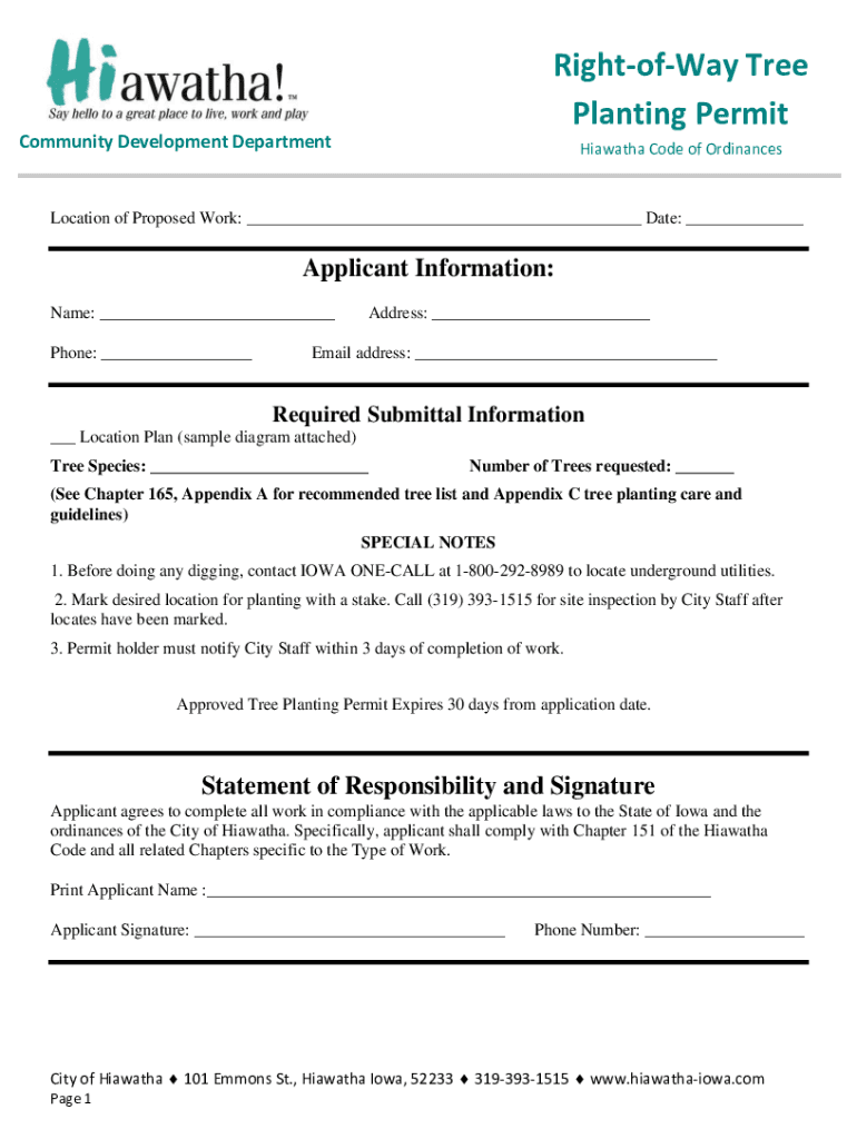RightofWay Tree Planting PermitCommunity Development Department Hiawatha Code of OrdinancesLocation of Proposed Work: ___ Date: ___Applicant Information: Name: ___ Phone: ___Address: ___Email address: