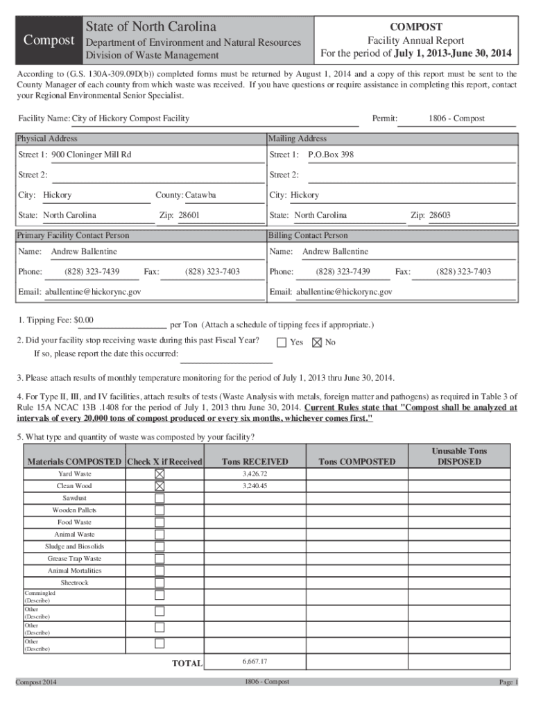 State of North Carolina CompostCOMPOST Facility Annual Report For the period of July 1, 2013June 30, 2014Department of Environment and Natural Resources Division of Waste ManagementAccording to (G.S.