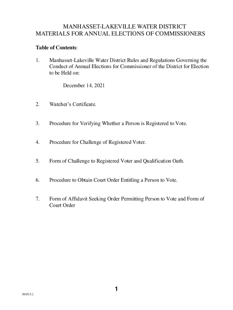 MANHASSETLAKEVILLE WATER DISTRICT MATERIALS FOR ANNUAL ELECTIONS OF COMMISSIONERS Table of Contents: 1. ManhassetLakeville Water District Rules and Regulations Governing the Conduct of Annual Elections