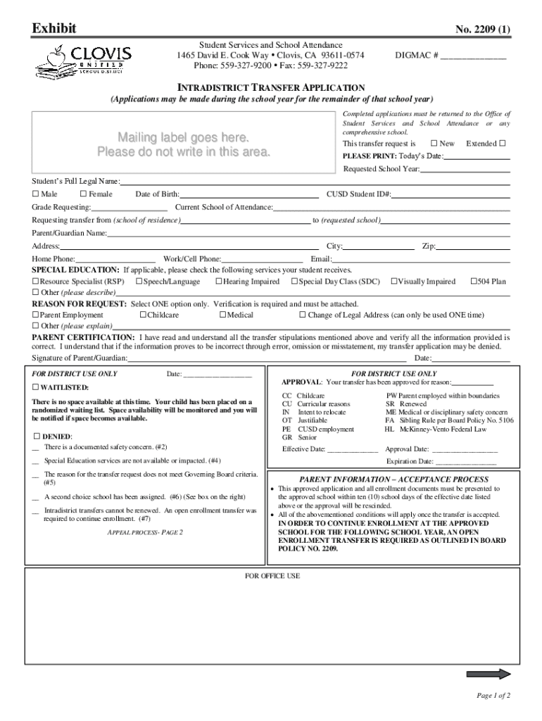 Exhibit No. 2209 (1) Student Services and School Attendance 1465 David E. Cook Way Clovis, CA 936110574 Phone: 5593279200 Fax: 5593279222DIGMAC # ___INTRADISTRICT TRANSFER APPLICATION (Applications