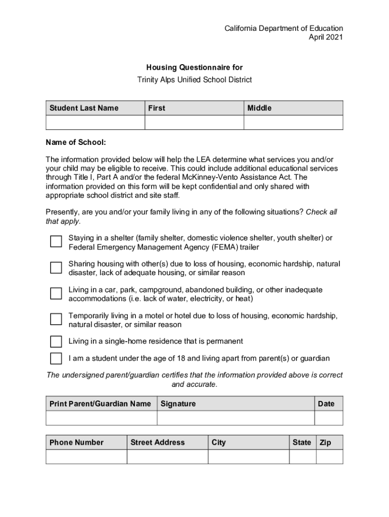 California Department of Education April 2021 Housing Questionnaire for Trinity Alps Unified School District Student Last NameFirstMiddleName of School: The information provided below will help the