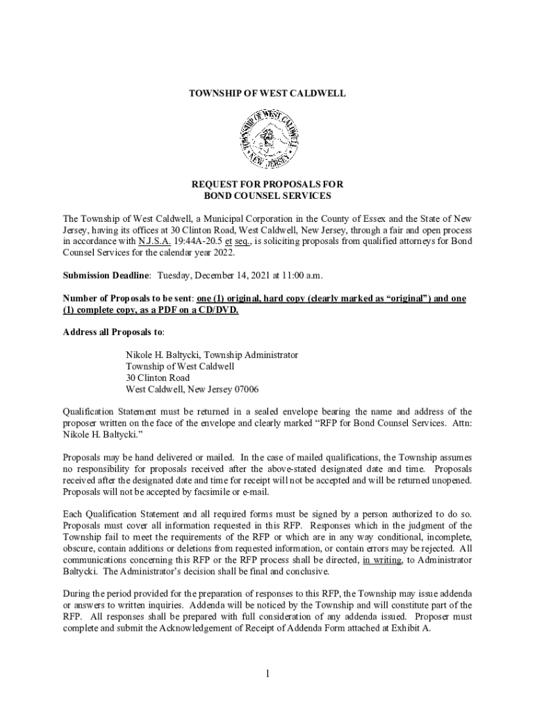 TOWNSHIP OF WEST CALDWELLREQUEST FOR PROPOSALS FOR BOND COUNSEL SERVICES The Township of West Caldwell, a Municipal Corporation in the County of Essex and the State of New Jersey, having its offices