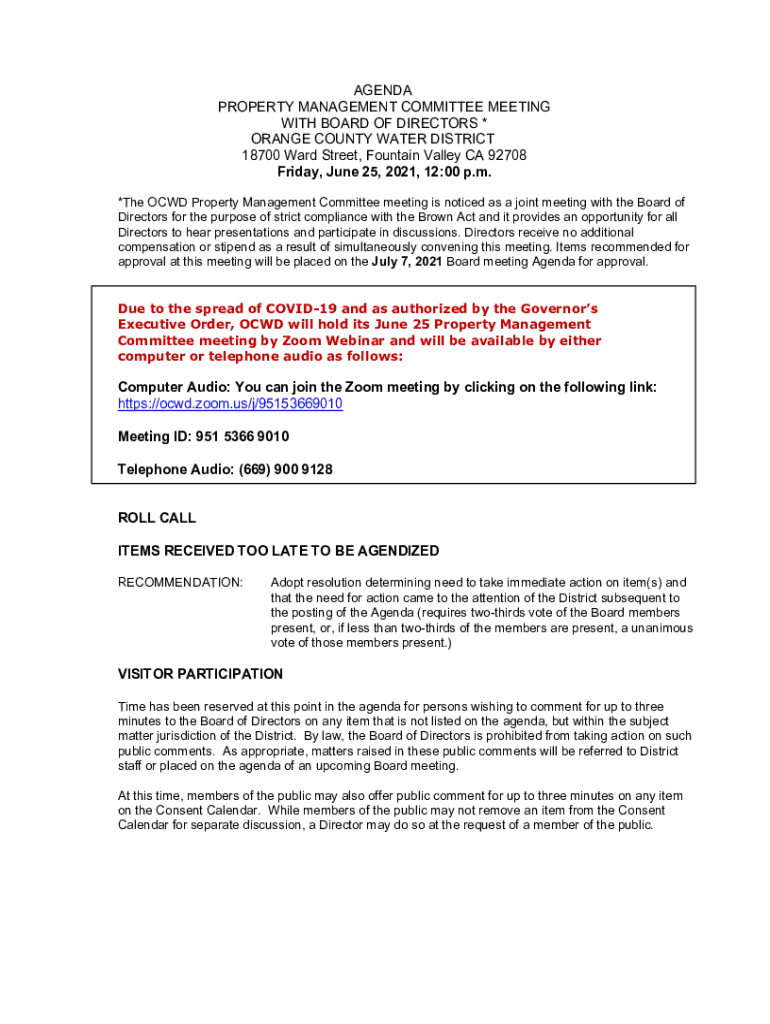 AGENDA PROPERTY MANAGEMENT COMMITTEE MEETING WITH BOARD OF DIRECTORS * ORANGE COUNTY WATER DISTRICT 18700 Ward Street, Fountain Valley CA 92708 Friday, June 25, 2021, 12:00 p.m. *The OCD Property