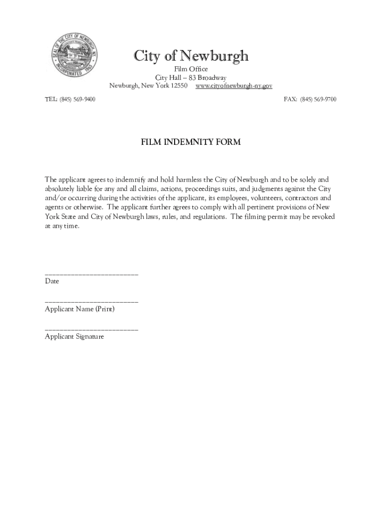 City of Newburgh Film Office City Hall 83 Broadway Newburgh, New York 12550www.cityofnewburghny.novel: (845) 5699400FAX: (845) 5699700FILM INDEMNITY Forth applicant agrees to indemnify and hold harmless