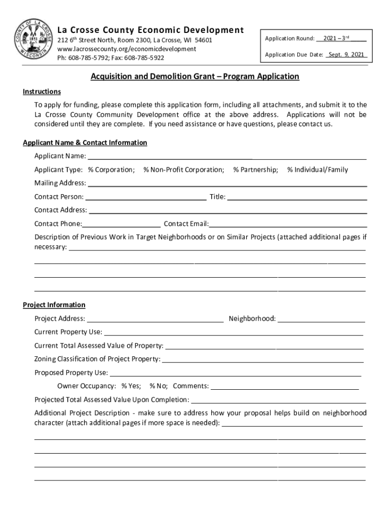 La Crosse County Economic Development 212 6th Street North, Room 2300, La Crosse, WI 54601 www.lacrossecounty.org/economicdevelopment pH: 6087855792; Fax: 6087855922Application Round:2021 3rd ___Application