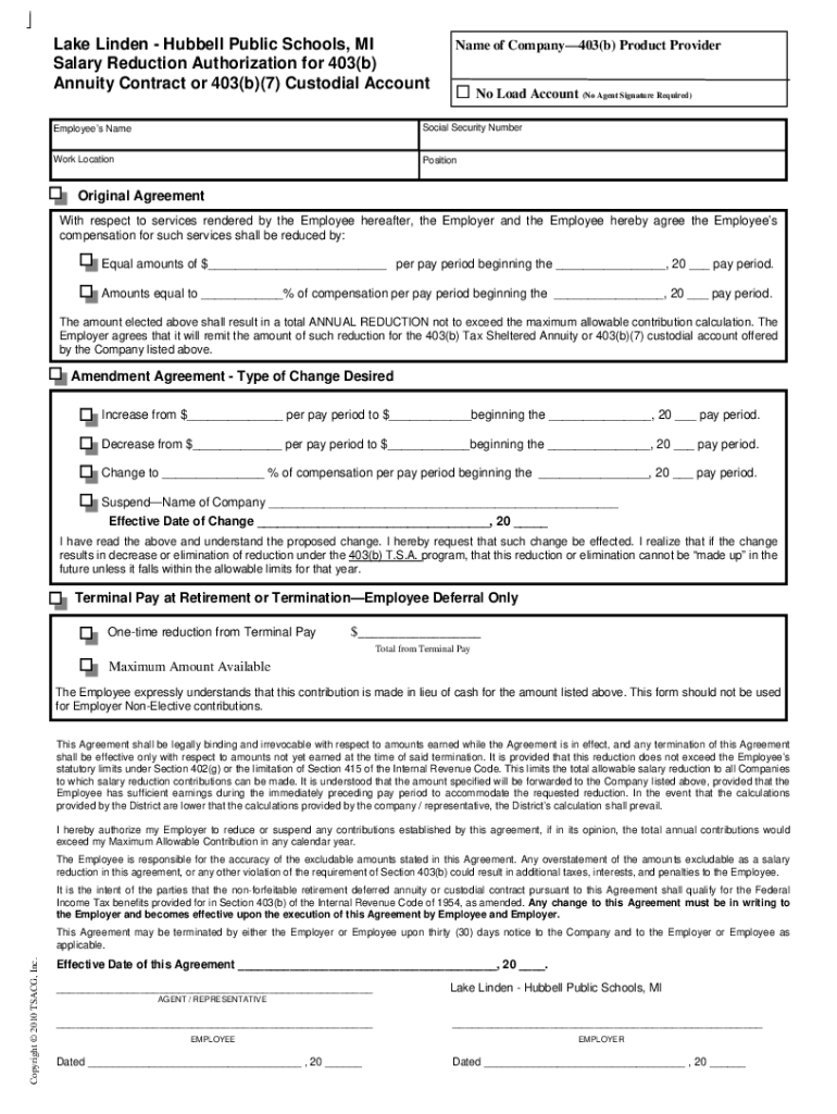 Lake Linden Hub bell Public Schools, MI Salary Reduction Authorization for 403(b) Annuity Contract or 403(b)(7) Custodial Accountable of Company403(b) Product Provider No Load Account (No Agent Signature