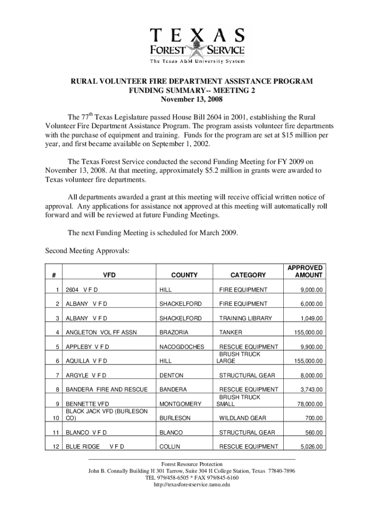 RURAL VOLUNTEER FIRE DEPARTMENT ASSISTANCE PROGRAM FUNDING SUMMARY MEETING 2 November 13, 2008, The 77th Texas Legislature passed House Bill 2604 in 2001, establishing the Rural Volunteer Fire Department