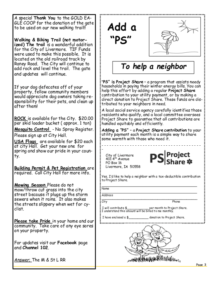 A special Thank You to the GOLD EAGLE COOP for the donation of the gate to be used on our new walking trail!! Walking & Biking Trail (not motorized) The trail is a wonderful addition for the City