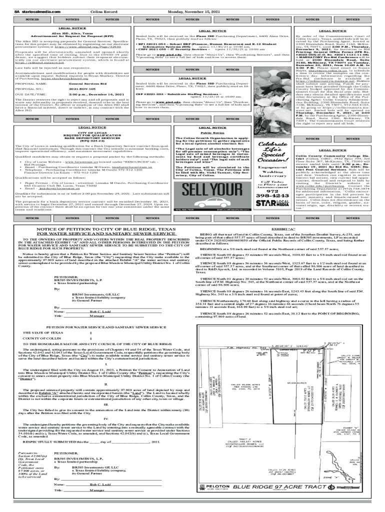 8A starlocalmedia.com Celina RecordNOTICESNOTICESNOTICESMonday, November 15, 2021, NOTICESNOTICESLEGAL NOTICE Allen ISD, Allen, Texas Advertisement for Request for Proposal (RFP) The Allen ISD is