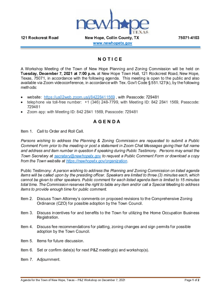 121 Rock crest Rodney Hope, Collin County, TX www.newhopetx.gov750714103NOTICE A Workshop Meeting of the Town of New Hope Planning and Zoning Commission will be held on Tuesday, December 7, 2021,