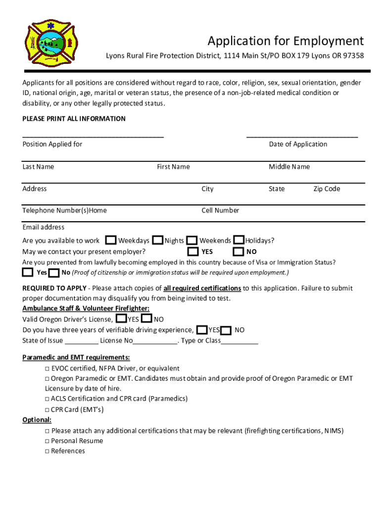 Application for Employment Lyons Rural Fire Protection District, 1114 Main St/PO BOX 179 Lyons OR 97358 Applicants for all positions are considered without regard to race, color, religion, sex, sexual