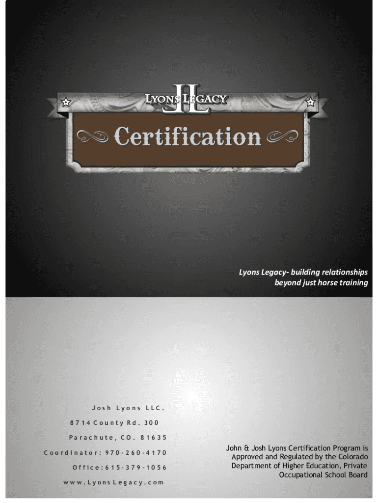 Lyons Legacy building relationships beyond just horse training Josh Lyons LLC. 8714 County Rd. 300 Parachute, CO. 81635 Coordinator: 9702604170 Office:6153791056 w w w. L y ONS L e g a c y. C on John