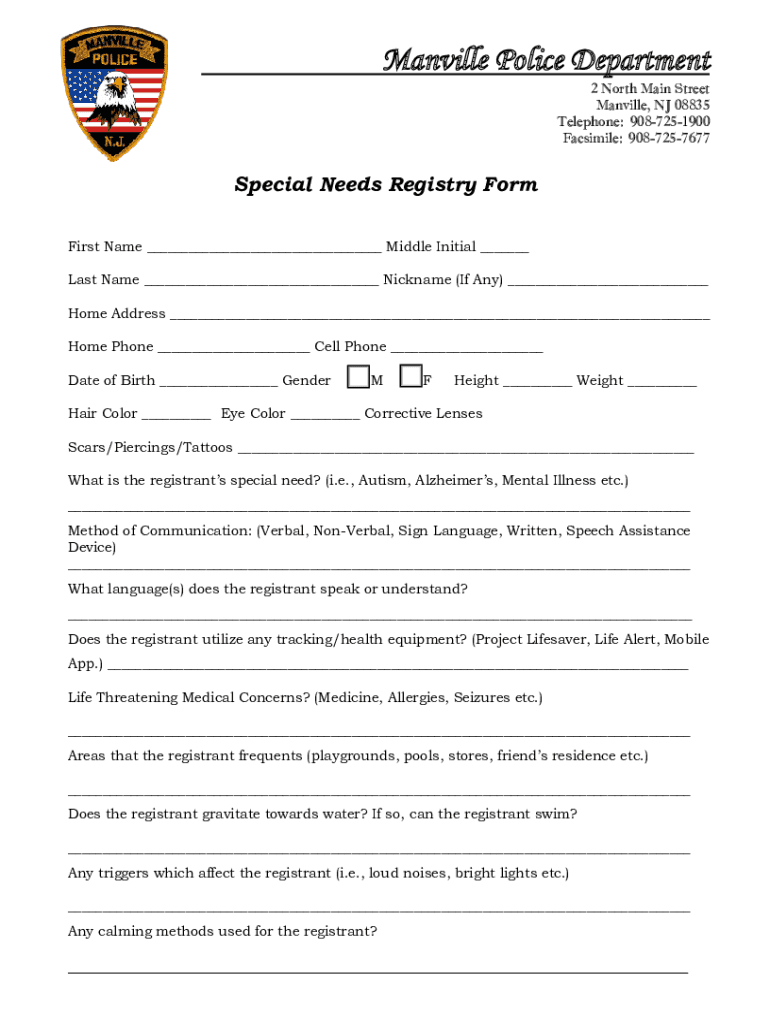 NJ Special Needs Registry Form - Manville 2021-2025 free printable template