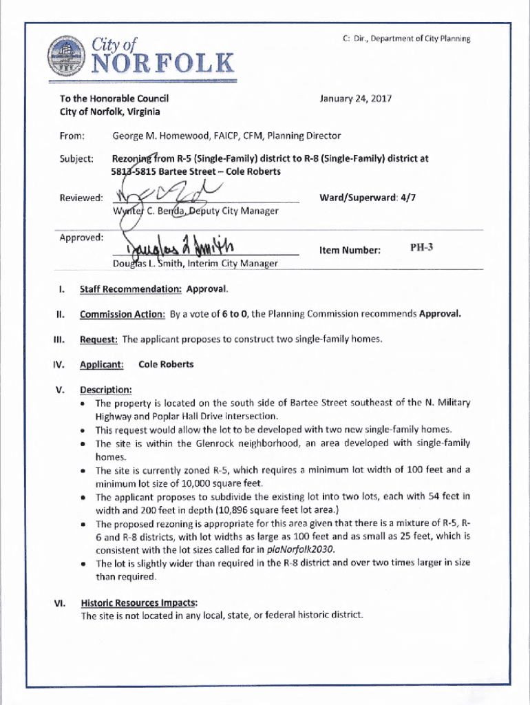 C: Dir., Department of City PlanningCity of NORFOLK To the Honorable Council City of Norfolk, Virginia January 24, 2017From:George M. Homewood, FICP, CFM, Planning DirectorSubject:Reconfirm R5 (SingleFamily)