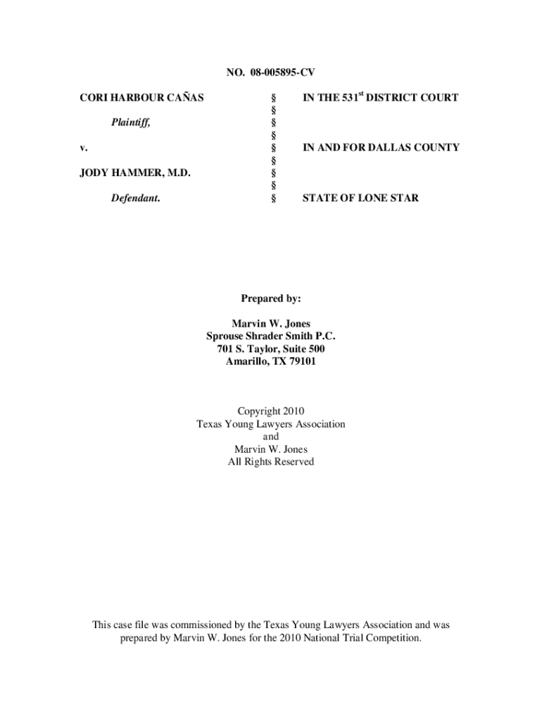 NO. 08005895CV CORI Harbor CARS Plaintiff, v. JODY HAMMER, M.D. Defendant. IN THE 531st DISTRICT COURTING AND FOR DALLAS COUNTYSTATE OF LONE STARPrepared by: Marvin W. Jones Spouse Schrader Smith