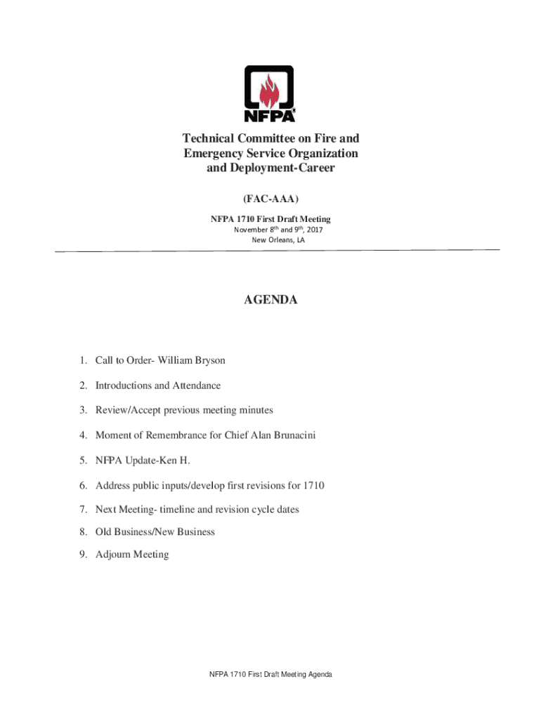 Technical Committee on Fire and Emergency Service Organization and DeploymentCareer (FAC AAA) NFPA 1710 First Draft Meeting November 8th and 9th, 2017 New Orleans, LAAGENDA1. Call to Order William