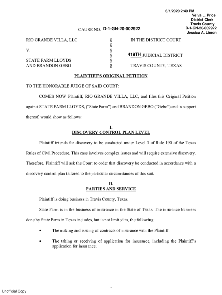 Get the free Rio Grande Villa, LLC v State Farm Lloyds et al1:20-CV ...