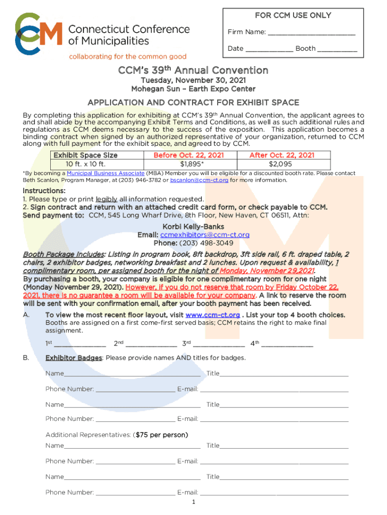 FOR CCM USE ONLY Firm Name: ___ Date ___ Booth ___CCS 39th Annual Convention Tuesday, November 30, 2021, Mohegan Sun Earth Expo CenterAPPLICATION AND CONTRACT FOR EXHIBIT SPACE By completing this