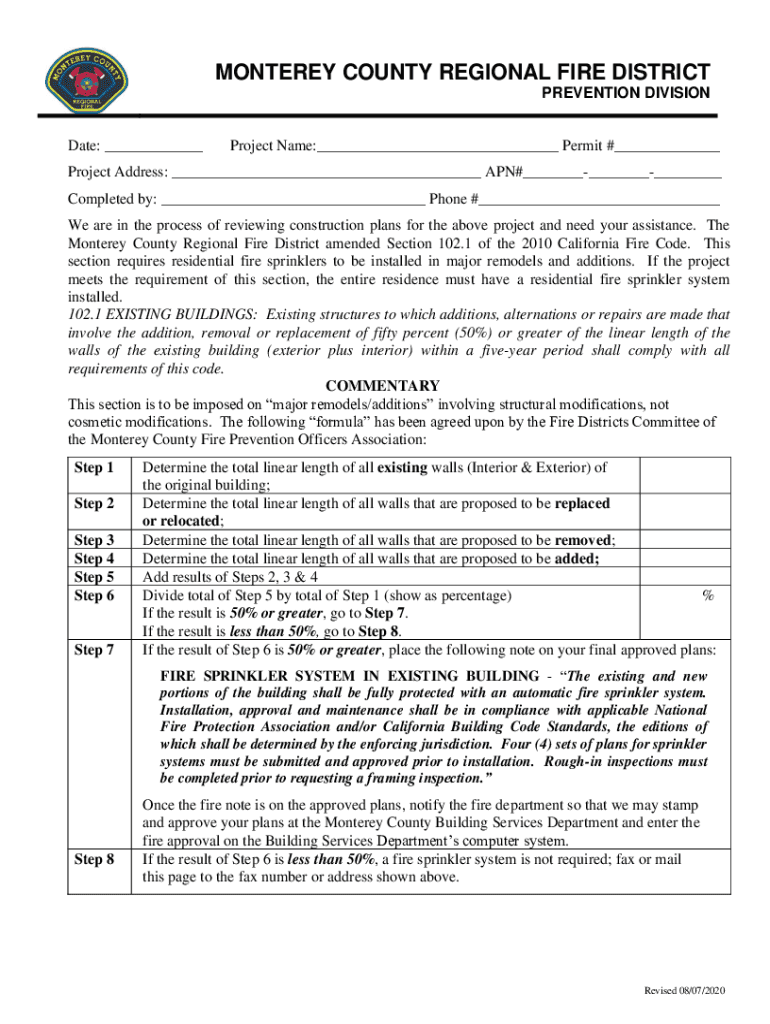 MONTEREY COUNTY REGIONAL FIRE DISTRICT PREVENTION DIVISION Date: ___Project Name:___ Permit #___Project Address: ___ APN#_________ Completed by: ___ Phone #___ We are in the process of reviewing construction