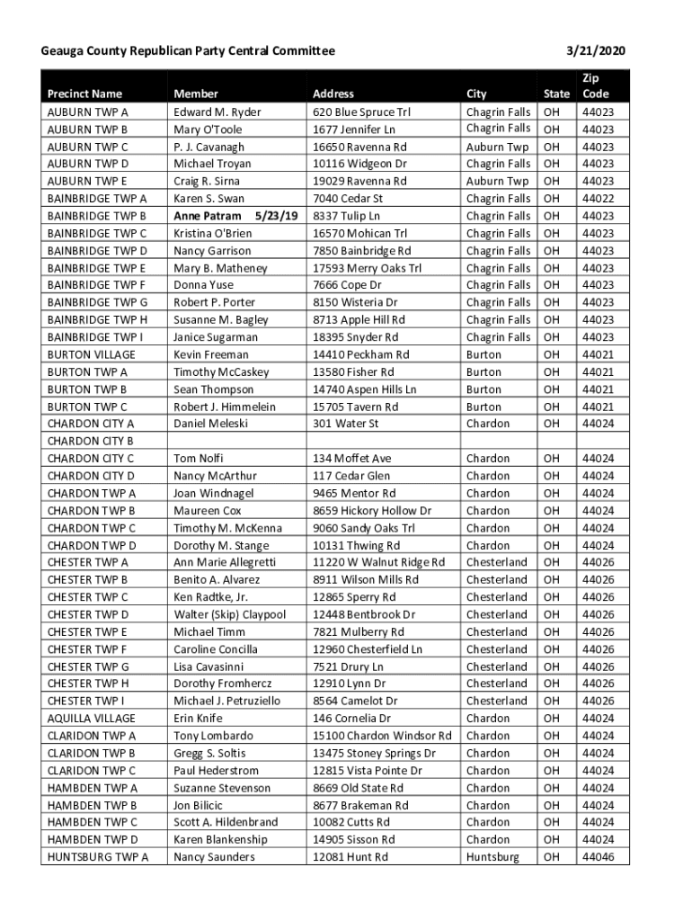 Gauge County Republican Party Central Committee Precinct Name AUBURN TWP A AUBURN TWP B AUBURN TWP C AUBURN TWP D AUBURN TWP E BAINBRIDGE TWP A BAINBRIDGE TWP B BAINBRIDGE TWP C BAINBRIDGE TWP D BAINBRIDGE