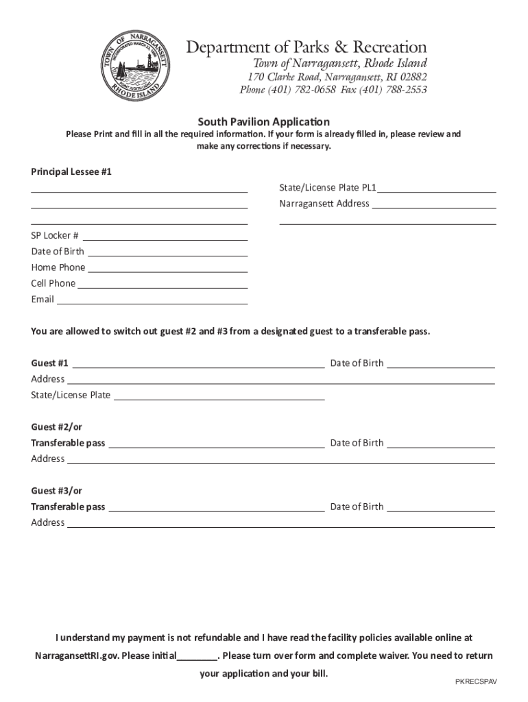 Department of Parks & Recreation Town of Narragansett, Rhode Island170 Clarke Road, Narragansett, RI 02882 Phone (401) 7820658 Fax (401) 7882553South Pavilion ApplicationPlease Print and fill in all