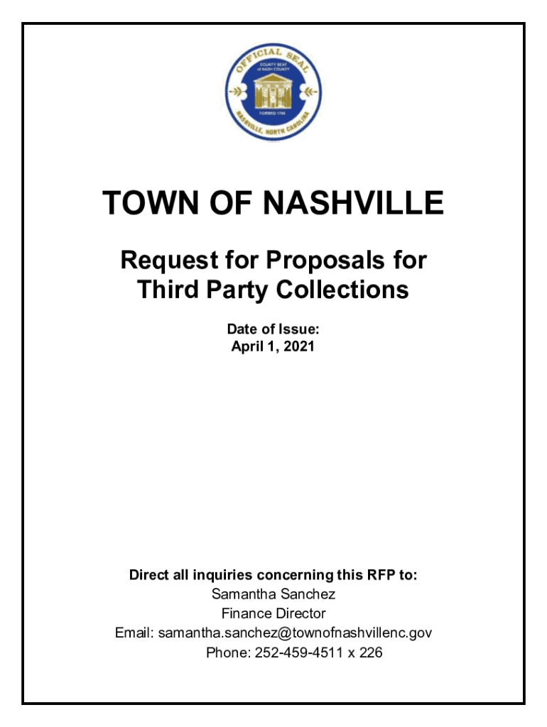 TOWN OF NASHVILLE Request for Proposals for Third Party Collections Date of Issue: April 1, 2021Direct all inquiries concerning this RFP to: Samantha Sanchez Finance Director Email: Samantha. Sanchez×townofnashvillenc.gov