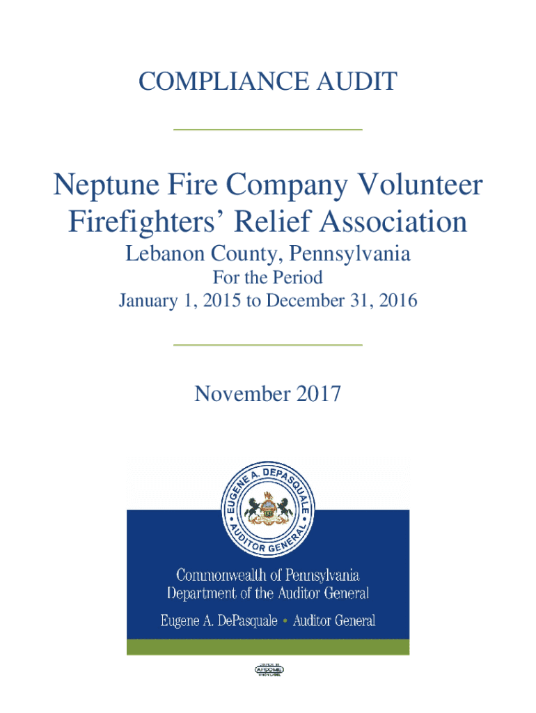 COMPLIANCE AUDIT___ Neptune Fire Company Volunteer Firefighters Relief Association Lebanon County, Pennsylvania For the Period January 1, 2015, to December 31, 2016___ November 2017Ms. Coleen Marks,