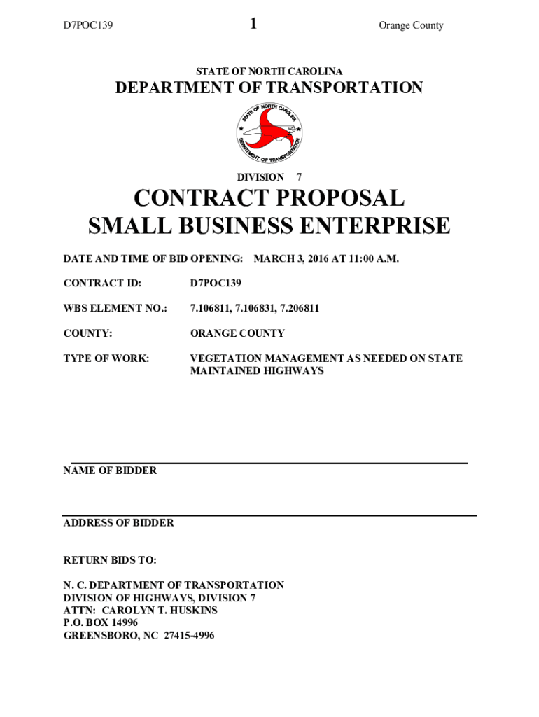 1D7POC139Orange CountySTATE OF NORTH CAROLINADEPARTMENT OF TRANSPORTATIONDIVISION7CONTRACT PROPOSAL SMALL BUSINESS ENTERPRISE DATE AND TIME OF BID OPENING: MARCH 3, 2016, AT 11:00 A.M. CONTRACT ID:D7POC139WBS