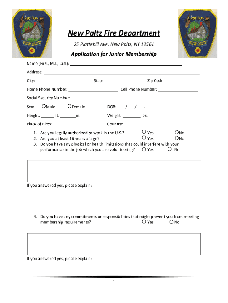New Waltz Fire Department 25 Platte kill Ave. New Waltz, NY 12561Application for Junior Membership Name (First, M.I., Last): ___ Address: ___ City: ___State: ___ Zip Code: ___Home Phone Number: ___