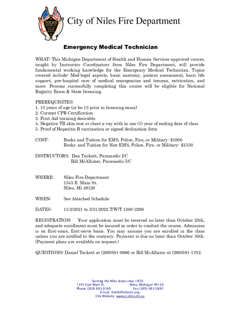 City of Nile's Fire Department Emergency Medical Technician WHAT: This Michigan Department of Health and Human Services approved course, taught by Instructor Coordinators from Nile's Fire Department,