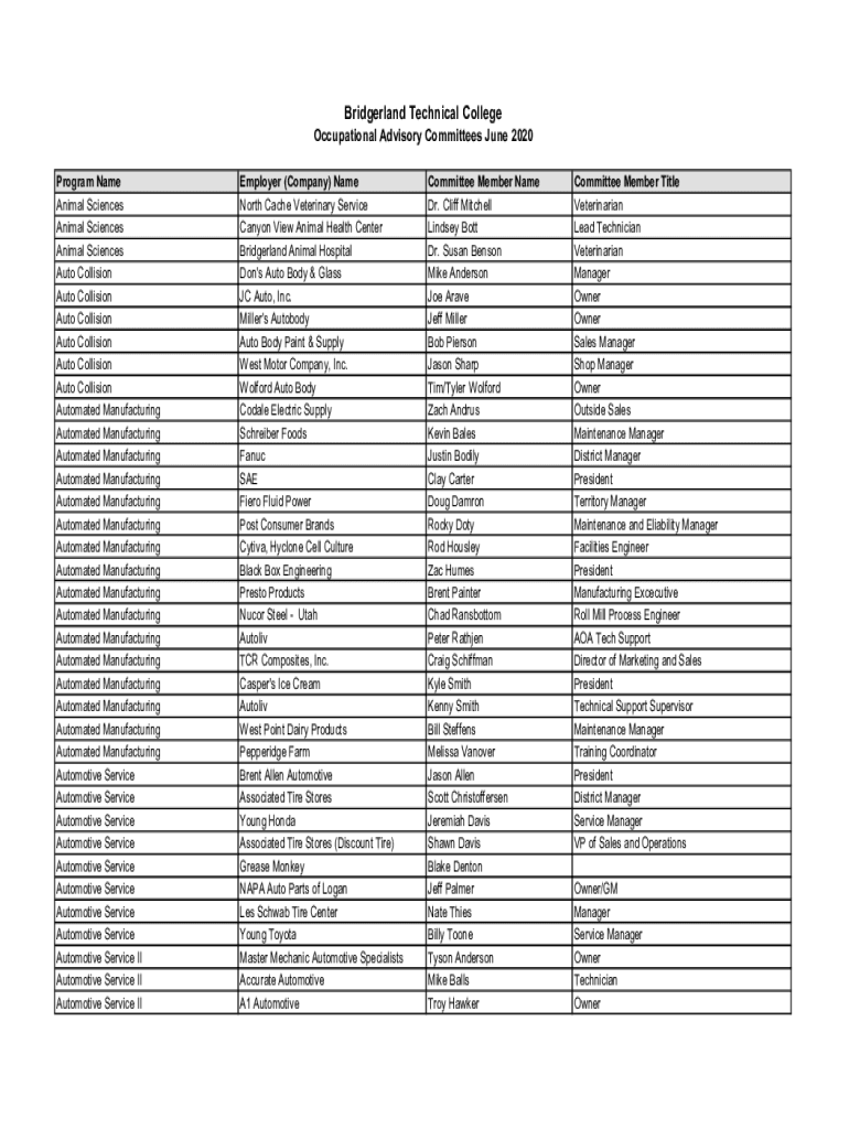 Bridger land Technical CollegeOccupational Advisory Committees June 2020 Program Name Animal Sciences Auto Collision Automated Manufacturing Automated