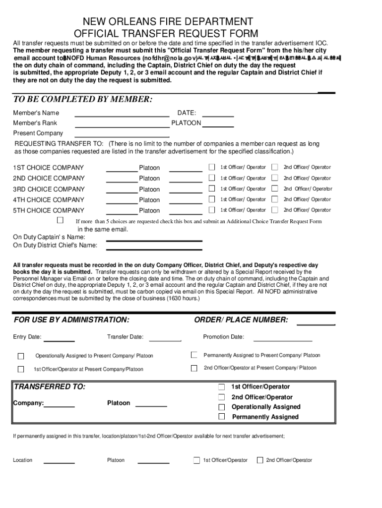 NEW ORLEANS FIRE DEPARTMENT OFFICIAL TRANSFER REQUEST FORM All transfer requests must be submitted on or before the date and time specified in the transfer advertisement IOC. The member requesting