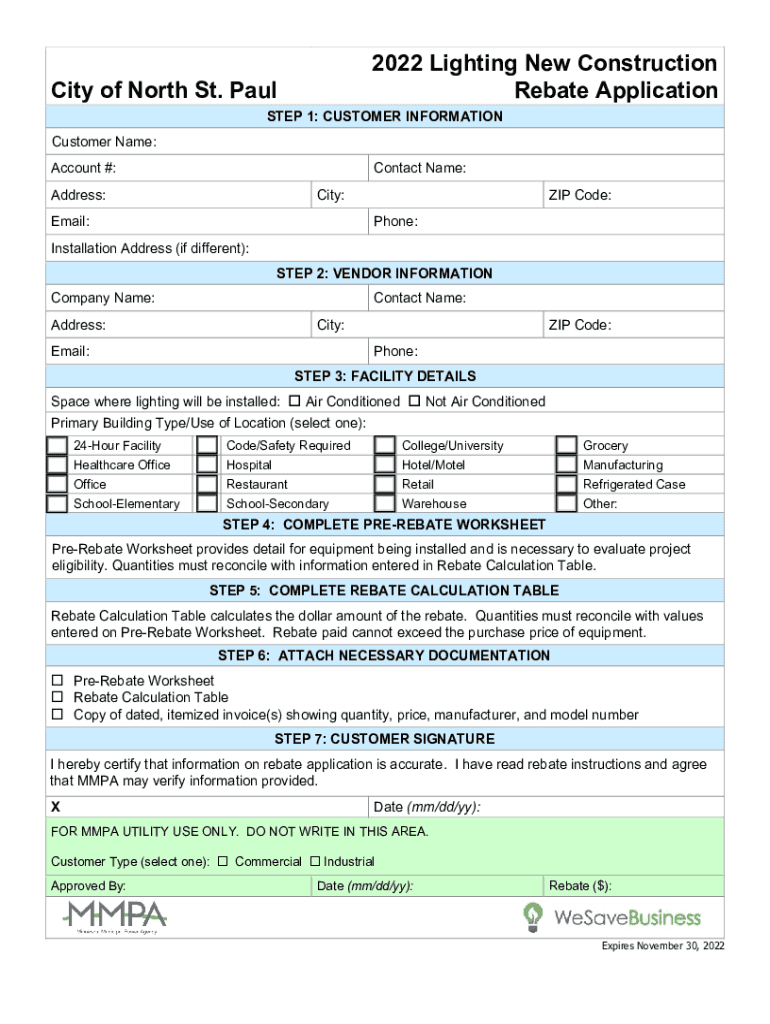Obtain the MN MMPA Lighting New Construction Rebate Application form from the official website or your local utility provider.
