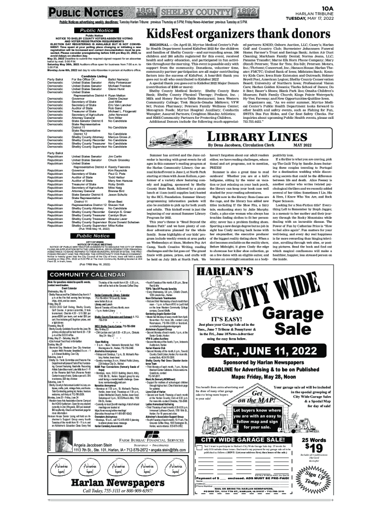 Public Notices1851ESTABLISHED10a1892 SHELBY COUNTY COURTHOUSE BUILT Harlan Tribune Tuesday, May 17, 2022Public Notices advertising weekly deadlines: Tuesday Harlan Tribune: previous Thursday at 5