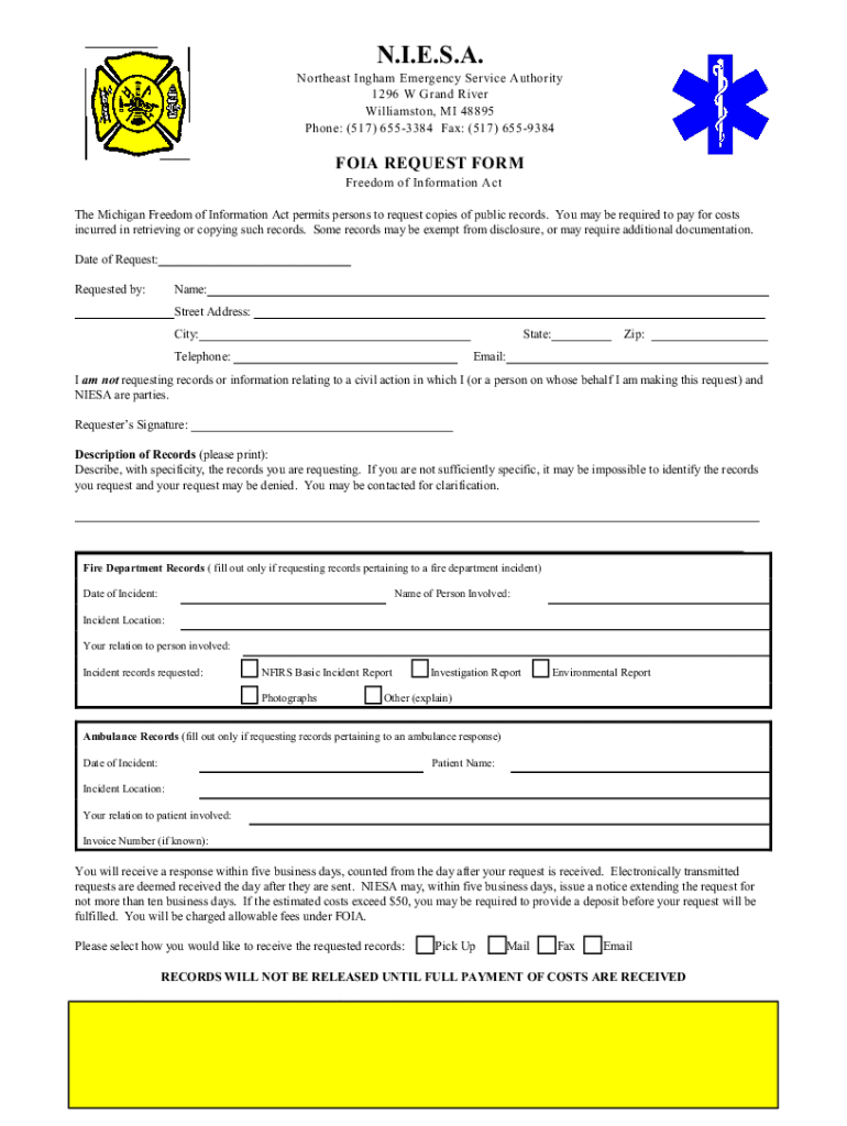 N.I.E.S.A. Northeast Ingham Emergency Service Authority 1296 W Grand River W Williamson, MI 48895 Phone: (517) 6553384 Fax: (517) 6559384FOIA REQUEST FORM Freedom of Information Act The Michigan Freedom