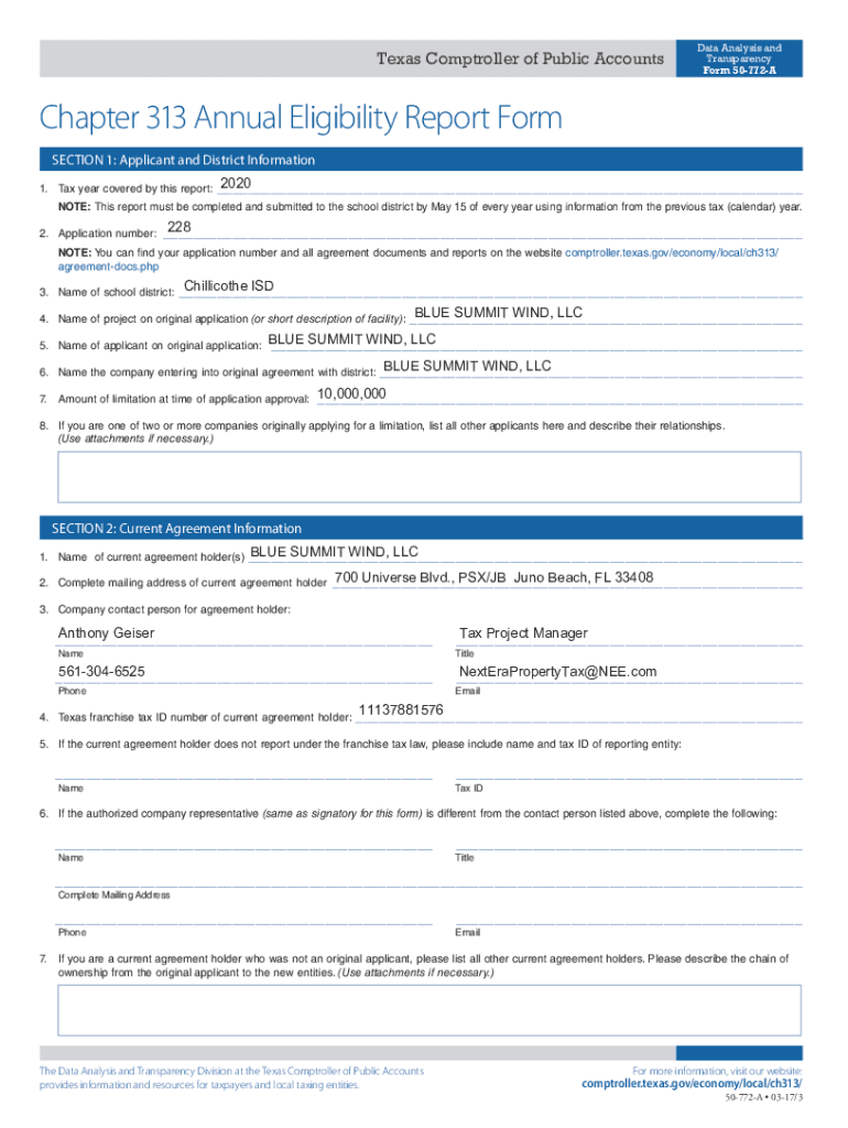 Texas Comptroller of Public AccountsData Analysis and Transparency Form 50772AChapter 313 Annual Eligibility Report Form SECTION 1: Applicant and District Information 1. Tax year covered by this report:2020