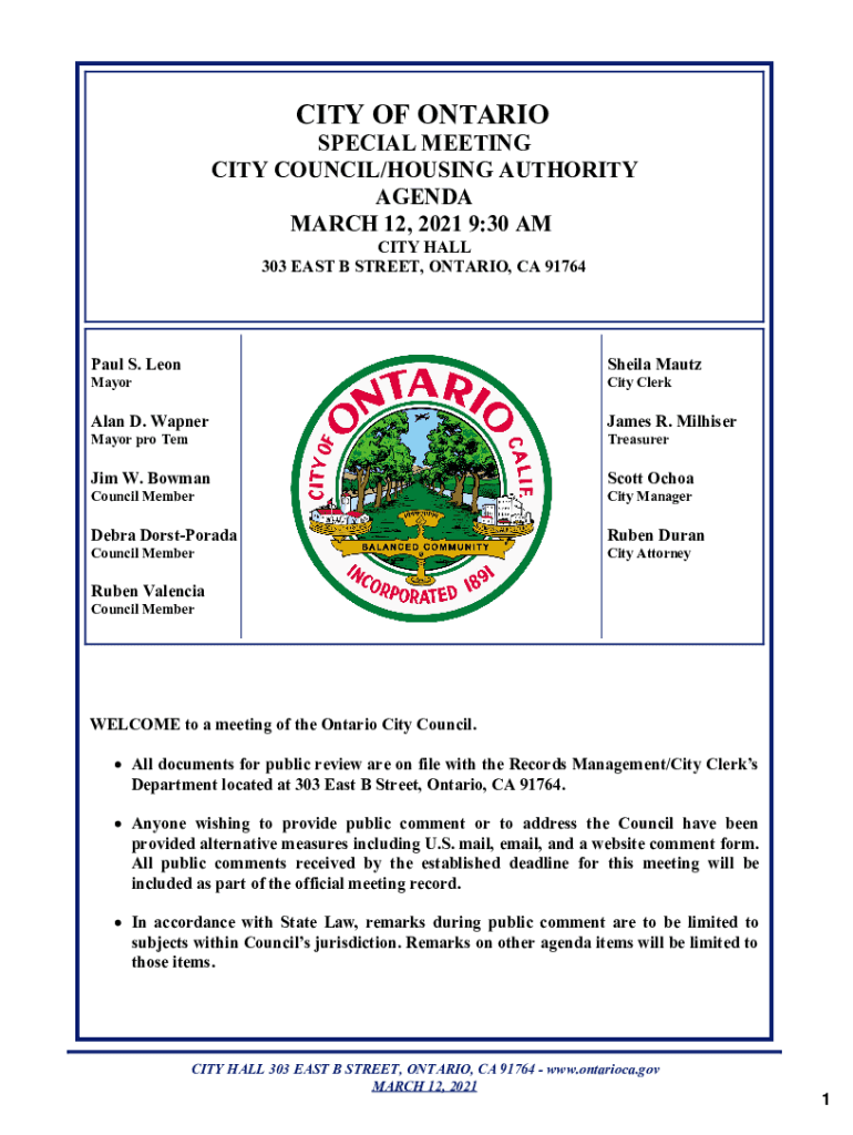 CITY OF ONTARIO SPECIAL MEETING CITY COUNCIL/HOUSING AUTHORITY AGENDA MARCH 12, 2021 9:30 AM CITY HALL 303 EAST B STREET, ONTARIO, CA 91764Paul S. Leon Sheila MautzMayorCity Clerk Alan D. WapnerJames