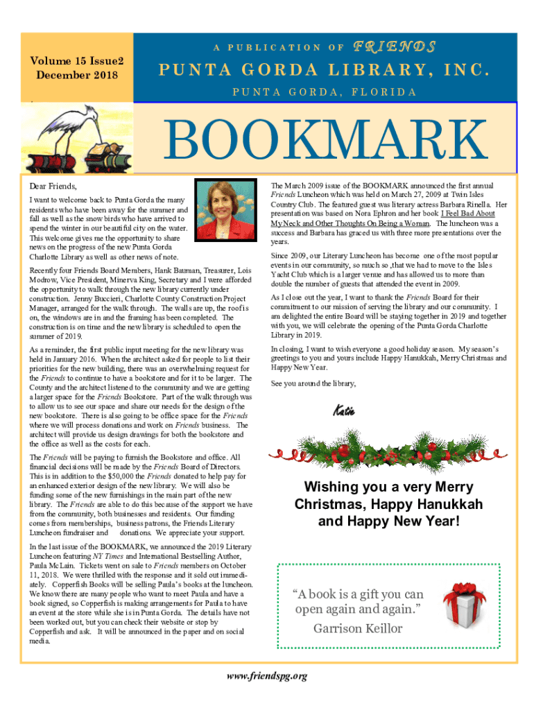 Volume 15 Issue2 December 2018PUBLICA TIONOFFRIENDSPUNTA GOLDA LIBRARY, INC. JUNTA GOLDA, FLORIDABOOKMARK Dear Friends, The March 2009 issue of the BOOKMARK announced the first annual Friends Luncheon