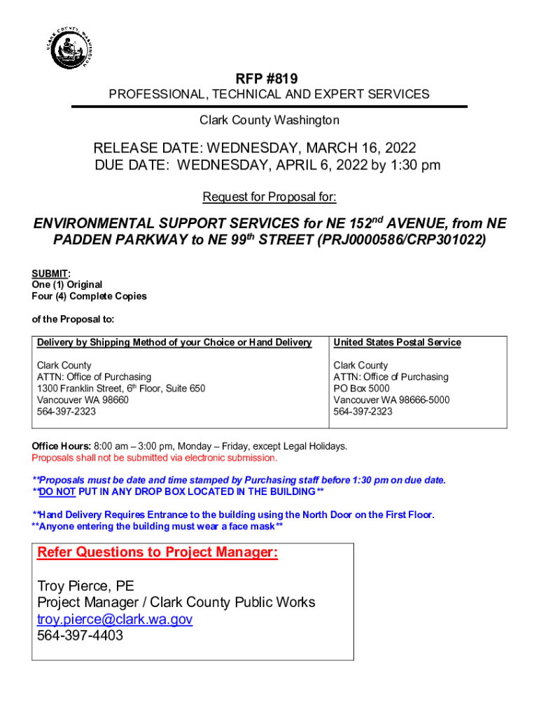 RFP #819PROFESSIONAL, TECHNICAL AND EXPERT SERVICES Clark County WashingtonRELEASE DATE: WEDNESDAY, MARCH 16, 2022, DUE DATE: WEDNESDAY, APRIL 6, 2022, by 1:30 pm Request for Proposal for:ENVIRONMENTAL