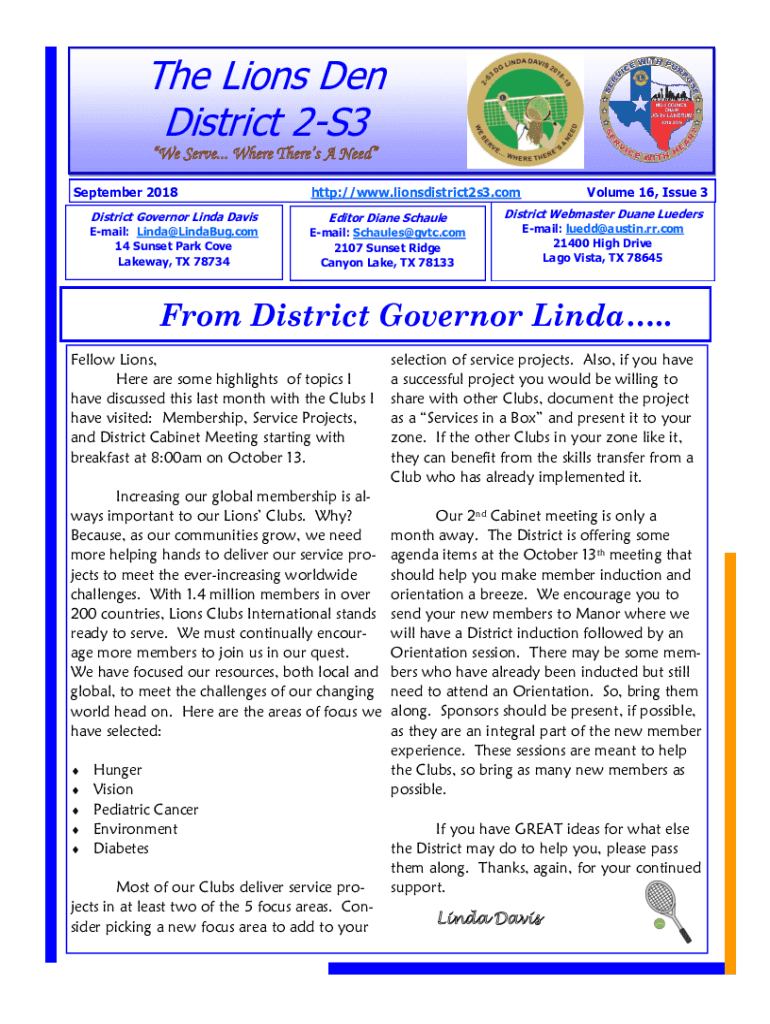 The Lions Den District 2S3 We Serve... Where There's A Need September 2018 District Governor Linda Davis Email: Linda×LindaBug.com 14 Sunset Park Cove Lake way, TX 78734http://www.lionsdistrict2s3.com