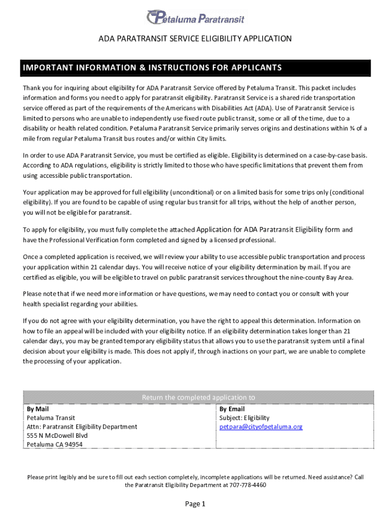 ADAPARATRANSITSERVICEELIGIBILITYAPPLICATION IMPORTANTINFORMATION&INSTRUCTIONSFORAPPLICANTS ThankyouforinquiringabouteligibilityforADAParatransitServiceofferedbyPetalumaTransit. Thispacketincludes