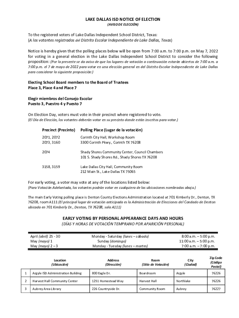 LAKE DALLAS ISD NOTICE OF ELECTION (AVIS ODE ELECTION)To the registered voters of Lake Dallas Independent School District, Texas: (A Los rotates registrants Del District Escolar Independent de Lake