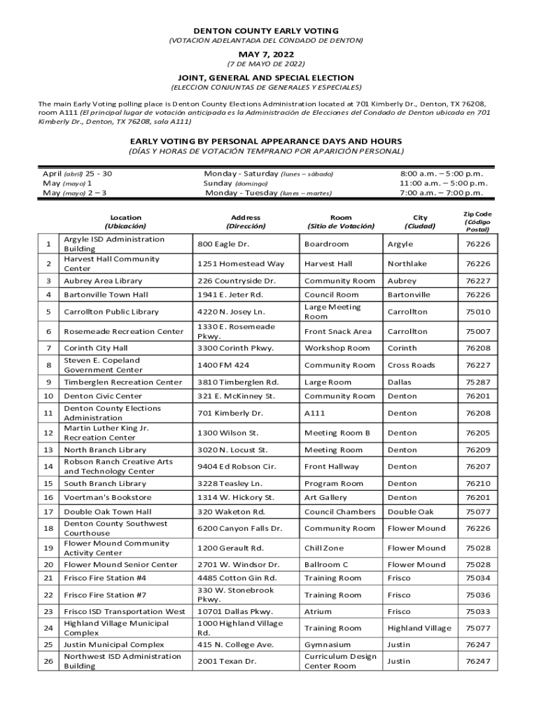 DENTON COUNTY EARLY VOTING(ROTATION ADELANTADA DEL CONRAD DE DENTON)MAY 7, 2022(7 DE MAYO DE 2022)JOINT, GENERAL AND SPECIAL ELECTION(ELECTION CONJUNCTS DE GENERALS Y ESPECIAL ES) The main Early Voting