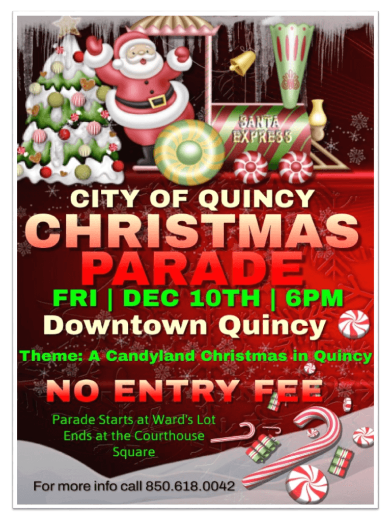 122 N. Graves Street www.myquincy.netQuincy, FL 32351 8506180042Greetings from the management and staff of the beautiful City of Quincy, Florida. On behalf of the City of Quincy Christmas Parade Committee,