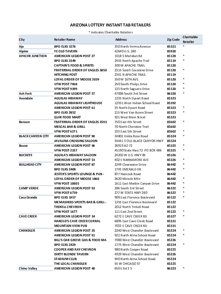 ARIZONA LOTTERY INSTANT TAB RETAILERS * indicates Charitable Retailers CityRetailer NameAddressZip CEDEAO Alpine APACHE JUNCTION BPO ELKS 1576 YE OLD TAVERN AMERICAN LEGION POST 27 BPO ELKS 2349 CAPTAIN\'S