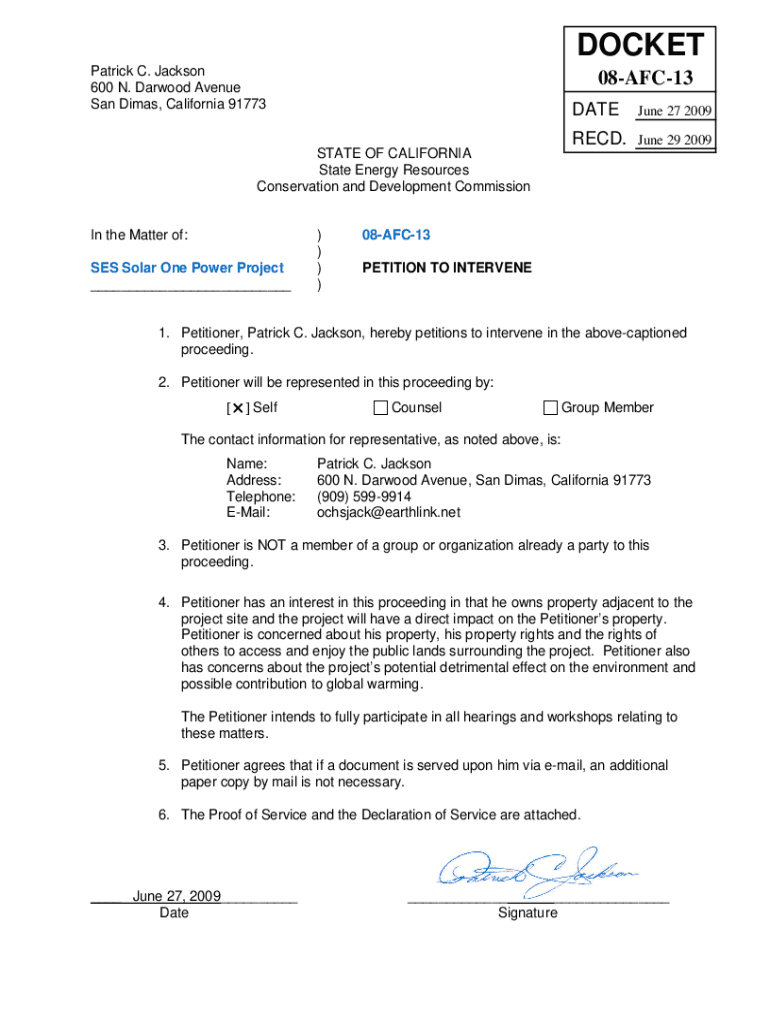 DOCKET Patrick C. Jackson 600 N. Dagwood Avenue San Dimas, California 9177308AFC13STATE OF CALIFORNIA State Energy Resources Conservation and Development Commissioning the Matter of: SES Solar One